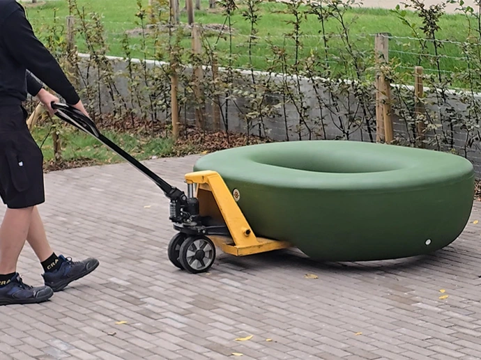 Het meubel kan met water worden verzwaard voor extra stabiliteit en is verplaatsbaar met een transpallet. Een duurzame en speelse oplossing die zich moeiteloos aanpast aan elke schoolomgeving.