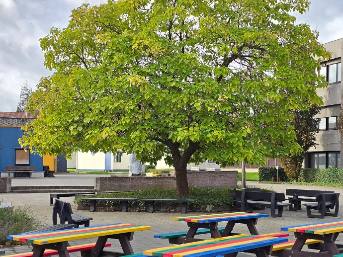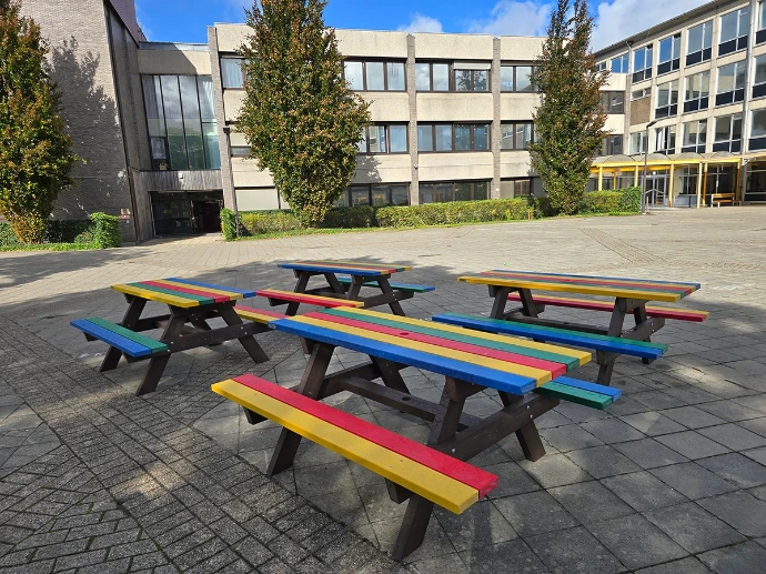 Ook kleurrijke Picknicktafels Maxi voorzien van een parasolgat.