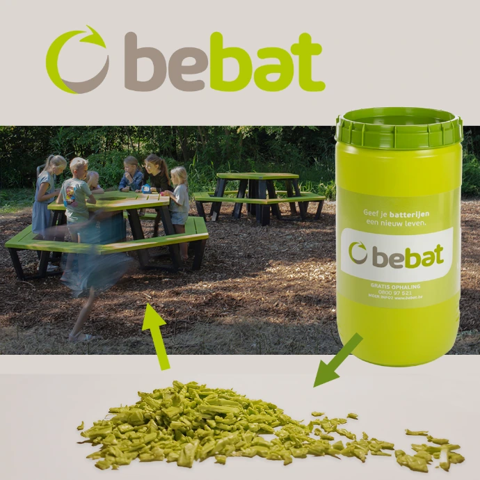 Door een samenwerking met Bebat werden alle vaten gereinigd, vermalen en verwerkt tot planken waarbij de typische groene kleur perfect behouden bleef. Niet enkel de kleur, maar ook de zeer UV-bestendige kwaliteit zorgen voor een enorm duurzaam en uniek product.